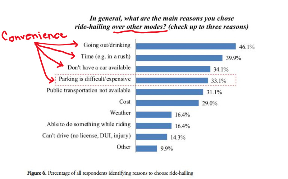 “Convenience” is the secret sauce of mobility and is the aggregate lived experience of a user. It includes performance metrics including usability, reliability, latency, and affordability. When Uber/Lyft are able to flood cities with on-demand cars waiting in queue, they are able to check most of these boxes.